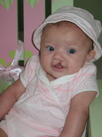 We went back to our plastic surgeon today and they removed the stents in Julia's nose and took off the steri-strips. It is like seeing your newborn all over again! The emotions are CRAZY! You know that this is your daughter, but it doesn't look like your daughter, at least not the one you brought home from the hospital. The most difficult part of the past week was her "no,no's" she had to wear on her arms so she would not touch her face. She hated them!!!! She has started drinking from a regular bottle, which is pretty cool. It feels weird now because we worked up to this day that we waited for since the day she was born and now it's over. That is it.... the doctors have repaired her lip and nose and that is it. It is just weird, I can't really explain it. I guess we just love her and kiss her and spoil her until her next surgery which they have scheduled for February 18th, if they decide she needs it. We will find out for sure on December 16th at our Craniofacial Team Meeting. Until next time:)